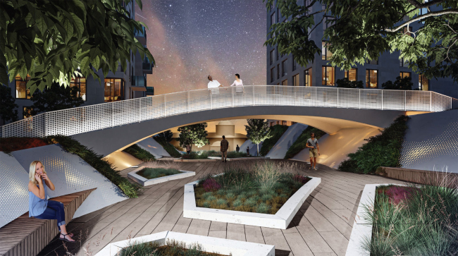 Все стоянки «спрятаны» под землей – так территория квартала полностью освобождается от движения личного транспорта. Благодаря перепадам рельефа, архитекторам удалось создать вертикальное зонирование – общедоступные и приватные зоны расположены на разных уровнях.