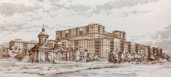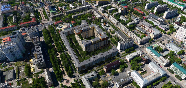 И хотя от белгородской крепости не осталось практически ничего, а от (1690-1707) только контуры лепесткового плана на площади к юго-западу от рассматриваемого участка, – Максим Атаянц, в память об исторических укреплениях, превратил свой вариант ЖК в подобие крепости с двумя контурами: внутренний дом, высокий, 12-этажный, представляет собой замкнутый прямоугольный контур с арками, трактованный как «детинец», внешний – крупную П-образную рамку 7-этажной высоты, «крепость».