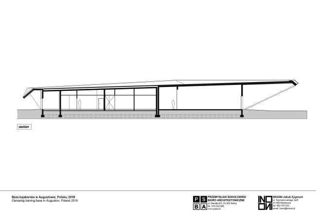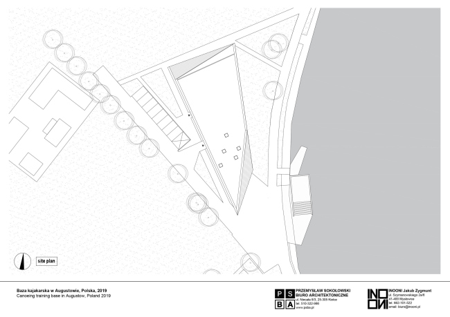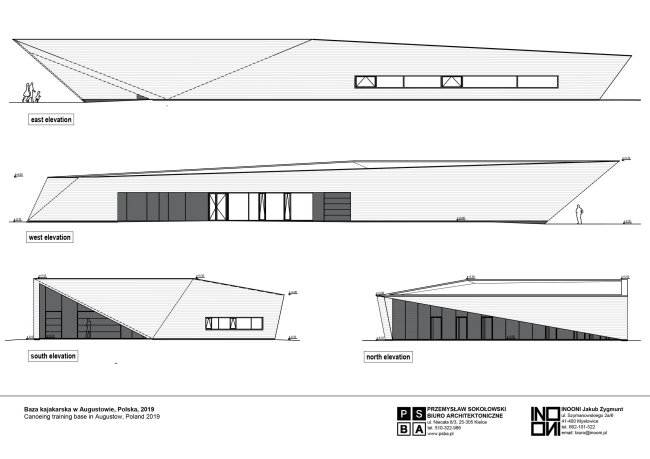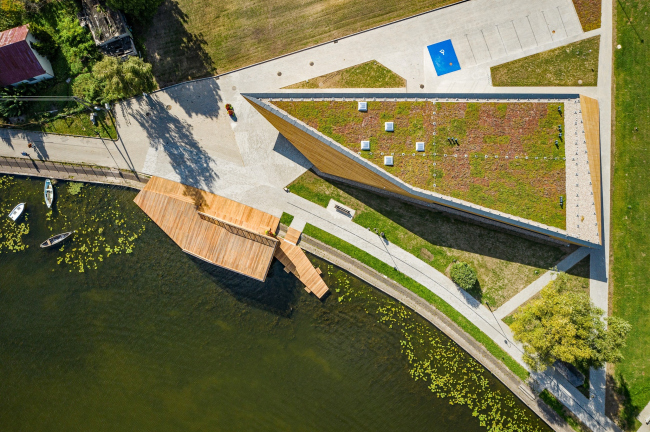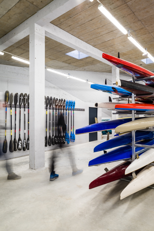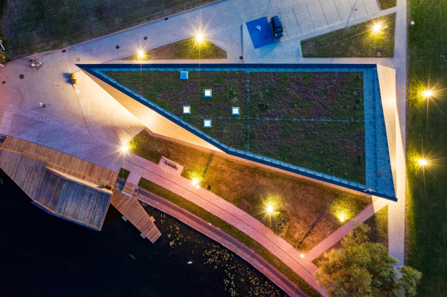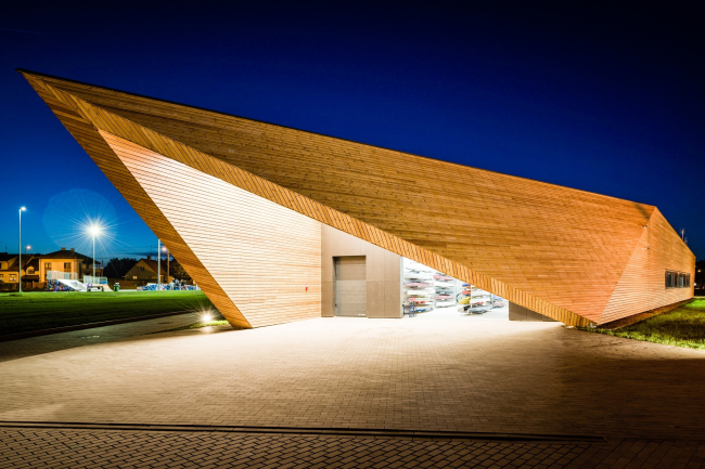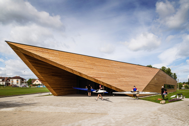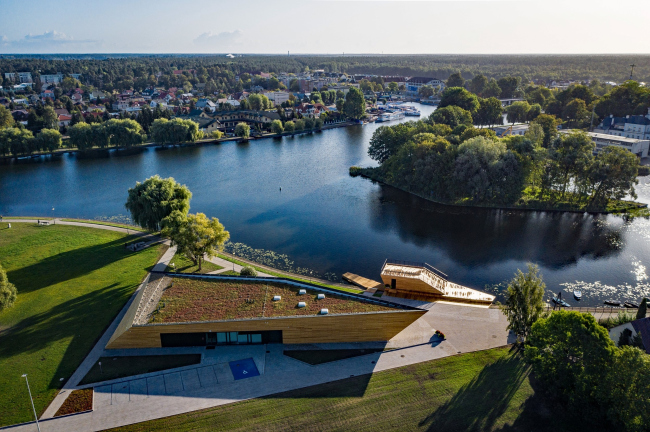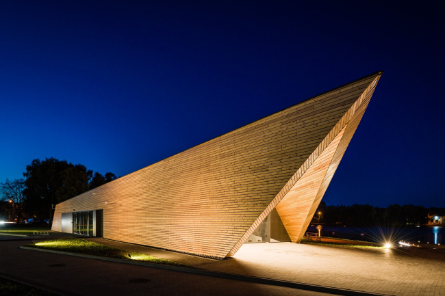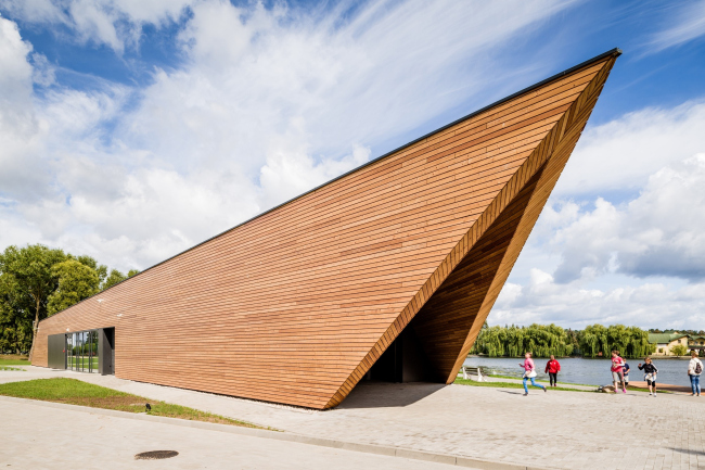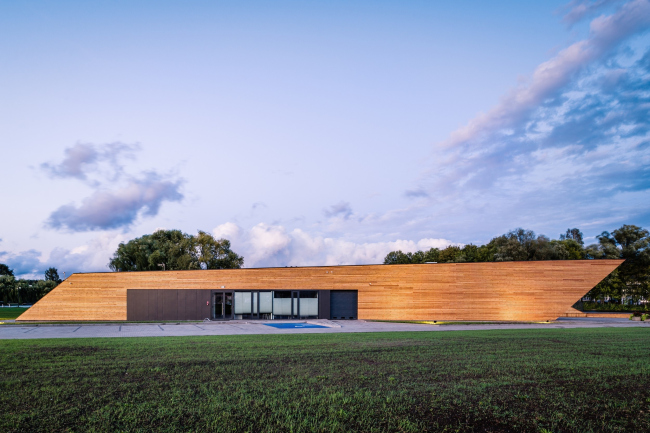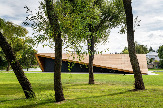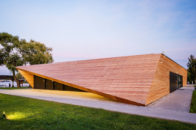Напоминающая оригами форма здания с острыми углами передает идею динамики. Перепад высот отвечает внутреннему устройству: ангар для хранения байдарок и мастерская расположены в более просторной части. Фасады базы обшиты досками сибирской лиственницы, кровля – озеленена.