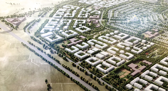 Планировка микрорайона строится двух осях. Первая – условная Главная улица, которая ведет от въезда с торговым центром к храму и олицетворяет собой «большой город»: здесь сосредоточится общественная жизнь. Вторая ось – рекреационная, зеленый бульвар, который объединит школы, детские сады и спортивные площадки. Между кварталами – небольшие «сквозные» парки, также полоса ЗНОП шириной около 30 метров защищает дома от Московского шоссе. Квартал таким образом получает зеленый каркас, который помимо прочего помогает сделать переход от индивидуальной застройки к городской более плавным.