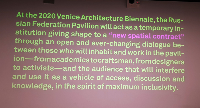 Тереза Мавика начала с того, что назначение комиссаром павильона было для нее неожиданным: «я начала задавать себе вопросы, много вопросов. И сейчас я хочу задавать вопросы, – даже не искать ответы, а скорее понять, правильны ли эти вопросы. Кто такой комиссар? Для чего он нужен? Что такое биеннале? Что такое национальный павильон в 2020 году? Все эти вопросы я мечтала задать Сергею Кузнецову, который делал выставки в Венеции уже четыре раза. У меня создалось впечатление, что в павильоне все время делались «отчётные» проекты, за исключением проекта Евгения Асса. Может быть наступило время, когда от выставочного модуса надо перейти к тому, чтобы что-то делать. Мне интересно понять, как мы можем пользоваться культурной институцией, чтобы каждый из вас, приехав в Венецию, почувствовал, что павильон часть вас. Сделать так, чтобы павильон работал».