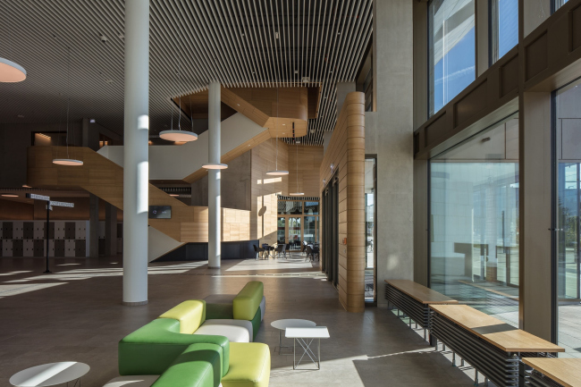 Кроме компактного объема здания, бетона и габионов, материалы в оформлении интерьера тоже выбраны в зависимости от их теплоемкости, также учитывался принцип «от колыбели к колыбели», cradle-to-cradle. Среди других эко-компонентов проекта – охлаждение и отопление помещений с помощью геотермальных тепловых насосов, солнечные батареи на крыше, активное использование естественного освещения, конструкция кровли из деревянных балок многослойной конструкции, где предусмотрена циркуляция воздуха.