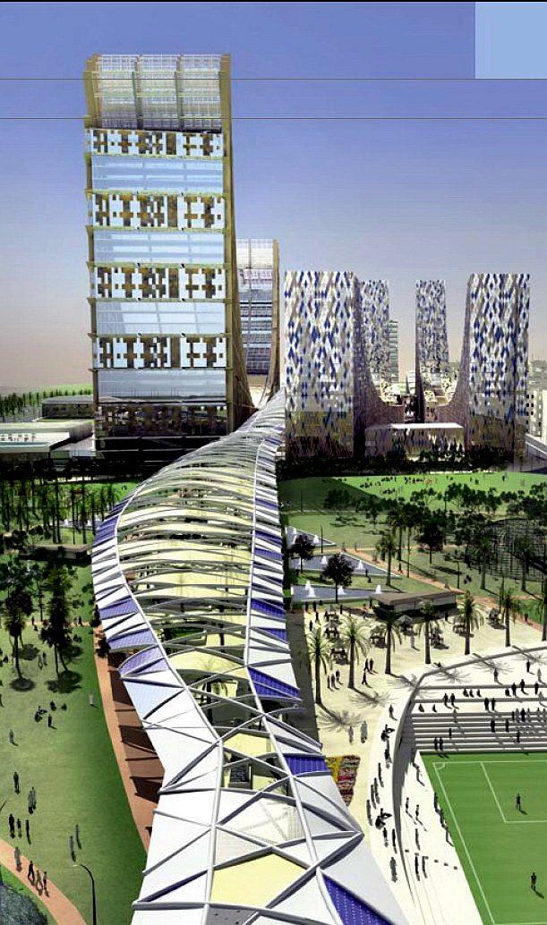 Название «Города будущего Хабари» - отсылка к прошлому: «хабари» называли оазисы - общественные центры, где кочевники могли встречаться с родственниками и друзьями, живущими в других частях пустыни. Теперь, как считают кувейтские девелоперы, такие встречи и неформальное общение обычно происходят в торговых центрах и кафе, поэтому в новом городе они займут главное место. Чтобы защитить жителей и гостей комплекса от сурового климата пустыни, по его центральной оси разобьют крытый парк длиной 2 км с фонтанами и площадями; вдоль него разместятся магазины и рестораны. Вокруг возведут спаренные башни с пологой «рампой» в центре: в этих малоэтажных секторах построек также разместятся перекрытые общественные пространства. В высотных зданиях устроят офисы на 7 000 сотрудников, квартиры на 2570 семей и гостиничный комплекс с конгресс-центром. Под землей построят один из самых обширных гаражей в мире - на 15 000 машин; там же проложат линию монорельсовой дороги для удобного перемещения жителей в пределах города. Вся инфраструктура, сеть торговых и развлекательных учреждений будет рассчитана на потребителей самого высокого уровня; это уже не первый подобный проект в Кувейте, и уже почти банальность, если взглянуть на это в масштабе региона. Многие государства Ближнего Востока пытаются заложить основу своего благополучия в будущем, когда их запасы нефти будут исчерпаны. Оптимальной альтернативой энергетической отрасли им представляется сфера туризма. Поэтому в последние 10-15 лет постоянно появляются (и уже реализуются) проекты «идеальных городов», где все жители – выходцы из разных стран мира - респектабельны и более чем обеспечены, инфраструктура и система жизнеобеспечения – на самом высоком уровне, а также нередко соблюдены самые жесткие «зеленые» стандарты. Остается только удивляться той легкости, с которой дельцы сферы недвижимости приближают будущее, знакомое по фантастическим романам: новая социальная структура создается всего лишь с помощью активной рекламы и продуманного вложения средств: утопия для обеспеченного меньшинства, антиутопия для армии обслуживающего персонала и строителей, уникальный полигон идей для архитекторов.Город будущего Хабари