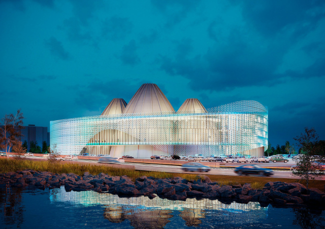 Структура должна получиться поблескивающей, но не как в первом варианте, где она напоминала лед с упорядоченными прожилками, а скорее как снег или облако. И прозрачной: со стороны озера на просвет хорошо просматриваются внушительные, с легким изгибом конусы театра, опоясанные стеклянным этажом и взлетающим к востоку то ли шарфом, то ли ожерельем. Картина получается отчасти традиционной, отчасти космической.