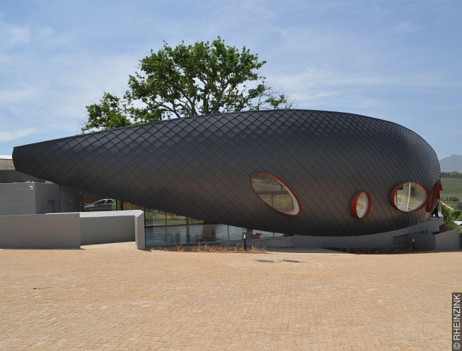 Купол, выполненный в технике ромбов из серо-голубого титан-цинка RHEINZINK-prePATINA blaugrau, нависает над низкой бетонной крышей, засаженной рестией – многолетним вечнозелёным травянистым растением, широко распространённым в Южной Африке, который символизирует соломенную крышу поместья Нью Кейп в голландском стиле и соединён со стеклянным крытым проходом. Таким образом, современное творение являет собой одновременно отражение построек разных эпох: хижин Кой-коинов и голландской усадьбы Нью Кейп.