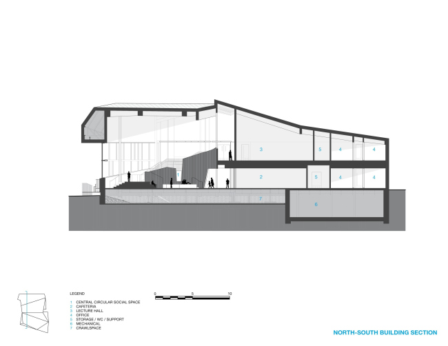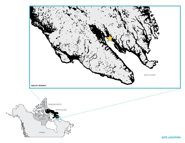 Постройка вписана в скалистый рельеф острова Баффинова Земля; ее форму также определили направления ветров – чтобы избежать формирования сугробов и защитить южный фасад с главным входом. Косая линия этой стороны здания параллельна расположенному рядом инуксуку, подчеркивая его значение.
