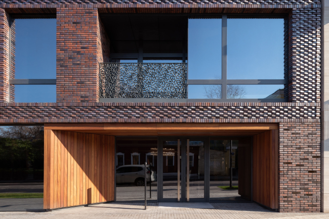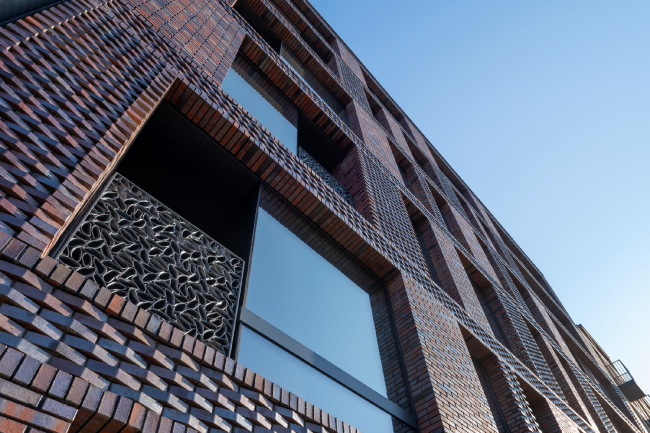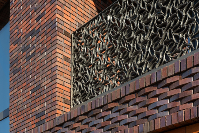 Металлизированный блеск окалины в кирпиче центрального фасада придает поверхности, особенно на солнце, интенсивное мерцание в переходах от оранжево-терракотового к серебристо-фиолетовому, синеватому, что напоминает о врубелевских майоликах: они тоже переливаются радужной пленкой. Но в данном случае живописный блеск не растекается, он помещен в рамки строгой системы, как будто бы скрещен с чем-то текстильным. Тем более что использован не кирпич, а ригельная плитка, и в фактурных частях углы не топорщатся, а больше напоминают ленты рельефного плетения, которые в свою очередь поднимаются по фасаду крупным меандром – так и хочется сказать: вот она, метафора городской ткани, как будто спроецирована на кирпичный фасад.
