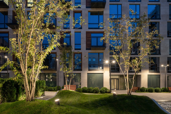 Самая интересная часть в центре – повышенный, как будто выдвинутый вверх из земли или, наоборот, обрезанный по краям до прямоугольника, газон с холмами геопластики. У него есть технический смысл: двор, как мы помним, расположен на кровле подземной парковки, и для размещения достаточного количества грунта для взрослого дерева уместен небольшой холм, дающий «запас». Но получилось еще и пластически интересно: то ли двор получил объемную инкрустацию холмистой местностью, то ли здесь в гранитных берегах застыл некий «ковер».