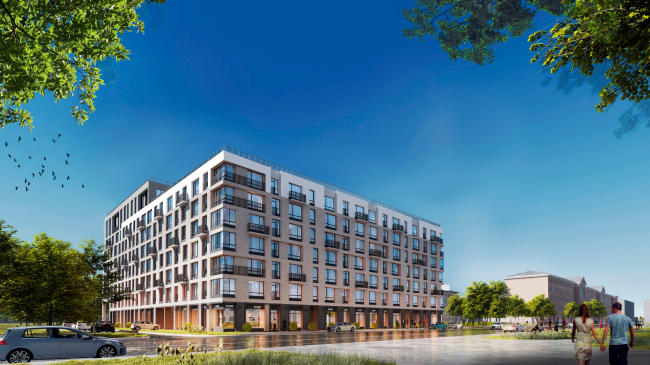 Пластичная за счет небольших выступов и углублений фасадная сетка усложняется незначительным смещением некоторых окон, которое делит основной объем здания на две трехэтажные части, а также цветовыми вставками и сочетанием разных фактур. Дом относится к категории «комфорт», что лишний раз подтверждает веру заказчика в потенциал места. Материалы планируют использовать дорогие: для цокольного этажа проект предполагает рустованные керамические панели со вставками с фактурой под дерево, для верхних этажей возьмут облицовочную плитку бежево-серой гаммы, а окна и витражи будут выполнены из алюминия, окрашенного в графитовый цвет. Ограждения балконов – строгая металлическая решетка.