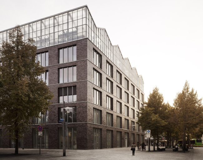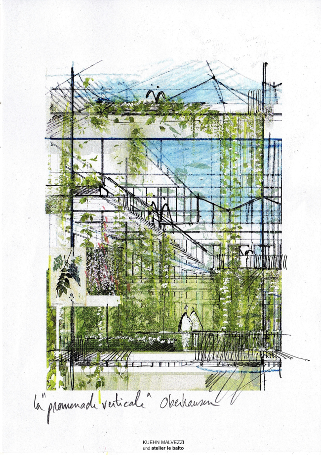 В 2016 конкурс на проект этого «гибрида» выиграло бюро Kuehn Malvezzi, которое подчеркнуло необычность соединения двух функций, центра занятости и теплицы, выбором материала. Офисная часть получила фасады из клинкера холодного темно-красного оттенка. Штабельная кладка выделяет его роль как облицовочного материала, а не «строительного», при этом кирпич – также дань местному контексту. Главные достопримечательности Оберхаузена, ратуша, главный склад Gutehoffnungshütte по проекту Беренса, ставший ныне музейным запасником, и другие заметные сооружения – именно кирпичные постройки начала XX века.
