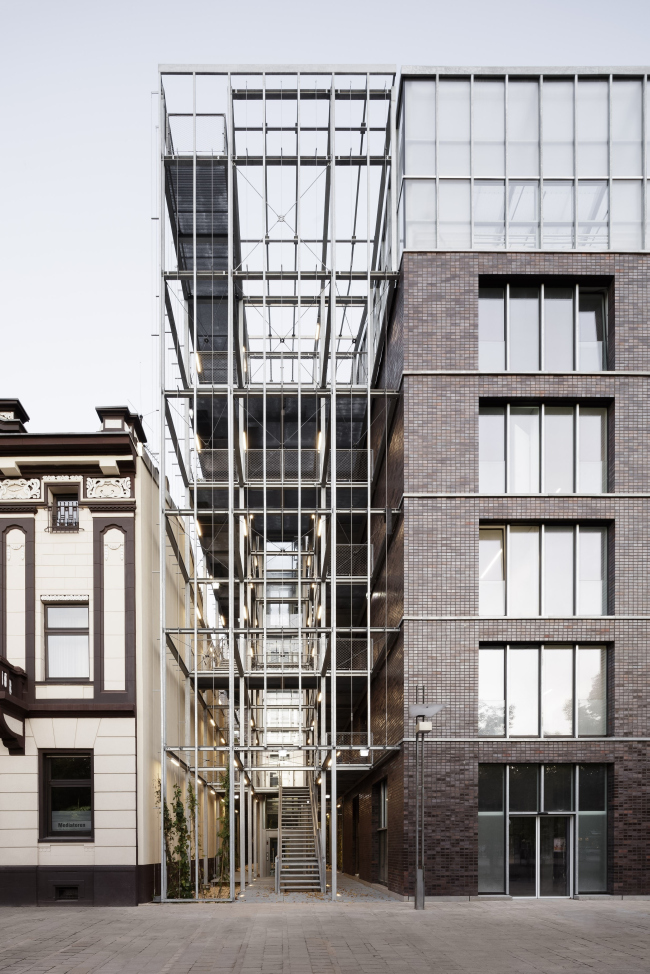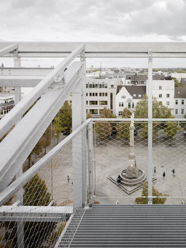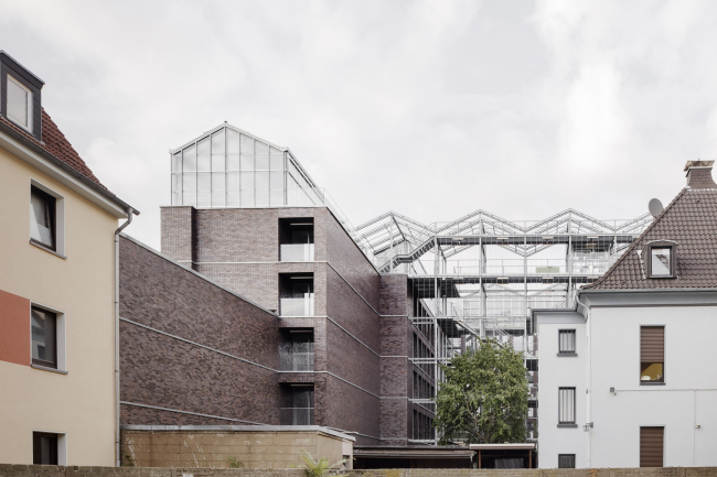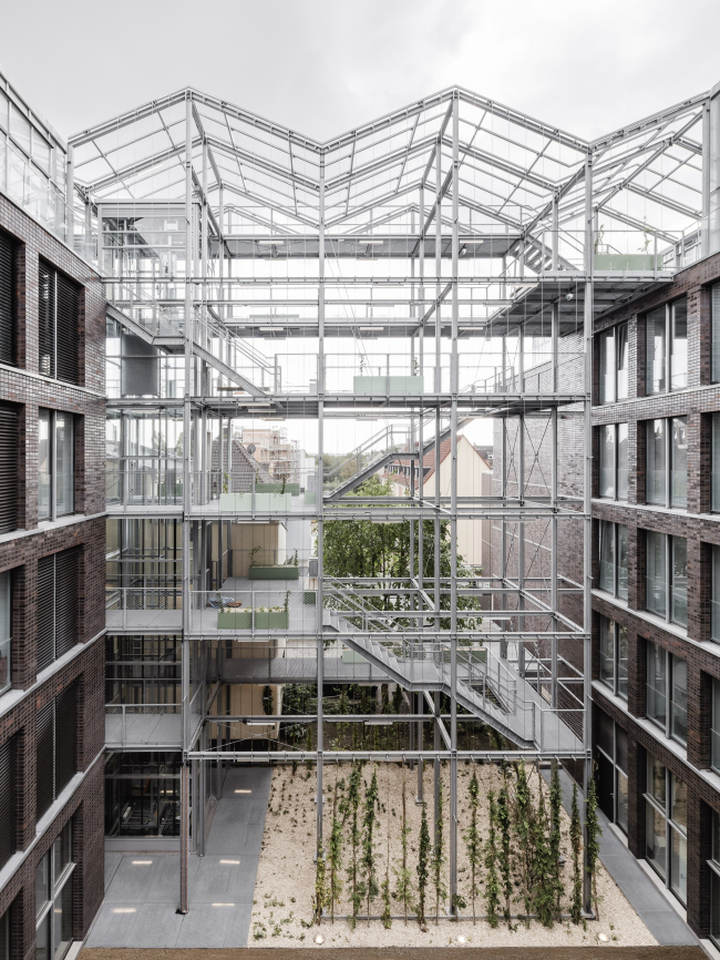 По сравнению с клинкерными фасадами почти бесшовно продолжающая их теплица, которая полностью занимает площадь крыши, кажется особенно легкой и проницаемой. Это ощущение разделяет с ней и «висячий сад», ведущий к ней от уровня земли. «Трельяж», как называют его архитекторы, вмещает лестницу, грузовой лифт и платформы этажей со скамьями. Он связывает рыночную площадь, где торгуют овощами и фруктами, с местом их производства – теплицей. На кровле также размещена терраса с панорамным видом города.