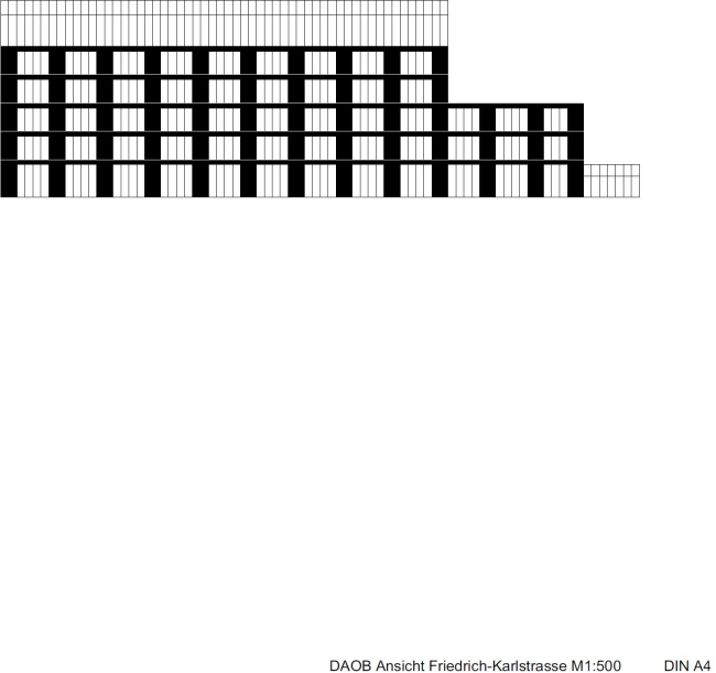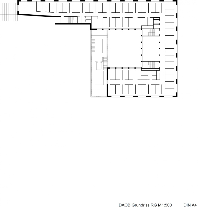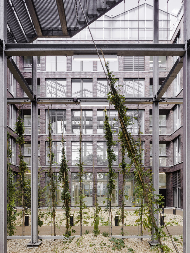 Двор внутри П-образного здания Kuehn Malvezzi озеленен с учетом его восприятия с верхних этажей и кровли – как картины пуантилиста. Ландшафт формирует уплотненный гравий; сухие и влажные участки разделены по высоте до 60 см. Там растут кусты, многолетники, папоротники и травы, а также три ирги. В этот сад выходит остекленный вестибюль центра занятости, который контрастирует с клинкером снаружи своими бетонными поверхностями.