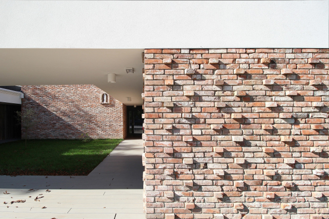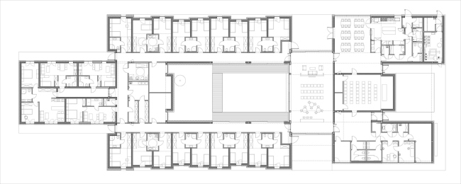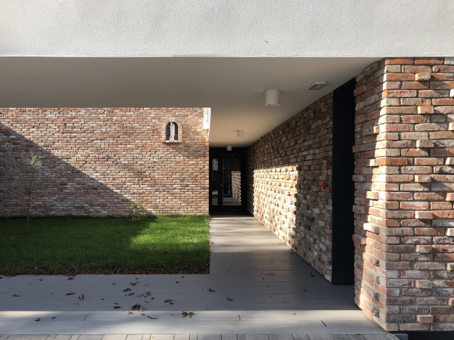 Одноэтажное здание (1485 м2) с волнообразной кровлей разделено стенами с фигурной кирпичной кладкой на три функциональные зоны. Ближе ко входу – часовня, административные помещения, залы для реабилитации, общая комната и столовая. Дальше идут 19 двухместных комнат с санузлом каждая, рассчитанных на разные физические возможности (хотя в целом в приюте – безбарьерная среда). В конце расположены три маленькие квартиры для сотрудников приюта, которые, так как это благотворительная католическая организация, видят в этом труде свой религиозный долг. Но этот труд в любом случае очень сложен, поэтому архитекторы сделали их часть здания изолированной, чтобы они могли там отдыхать, отрешившись от внешнего мира.
