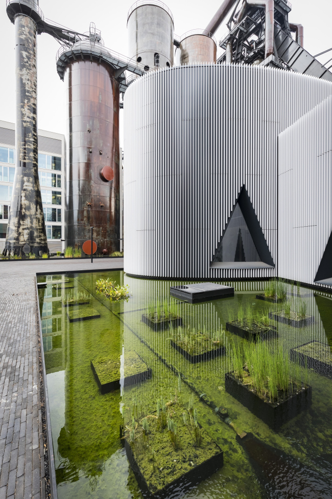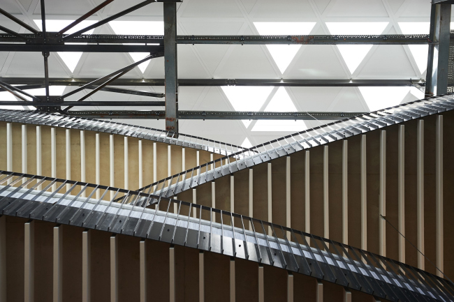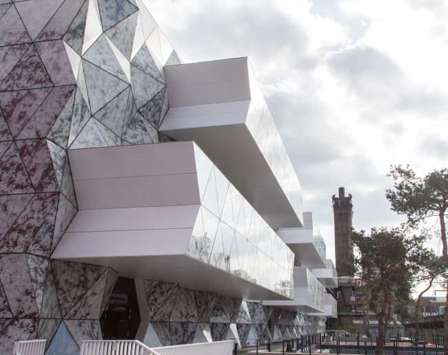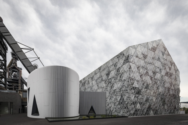 Учебный центр бюро Valentiny Hvp Architects вполне может посоперничать с паблик-артом своим необычным обликом. В основе это вполне утилитарный параллелепипед, бывший силос для хранения руды у подножия домны B. Но в наши дни его прагматическая форма скрыта за фасадом из треугольных панелей с шелкографическим мраморным узором. Даже плоские его части выглядят очень эффектно, но особенное впечатление производит западная, объемная сторона с «пирамидами». Внутри сочетание прозрачных и матовых панелей создает мягкую игру света и тени. Учебный центр Люксембургского университетаФото © Guy Jallay