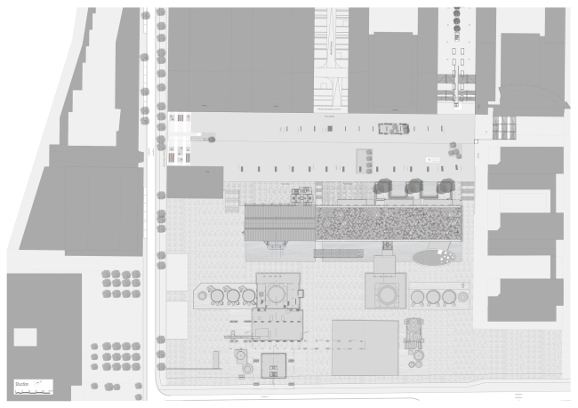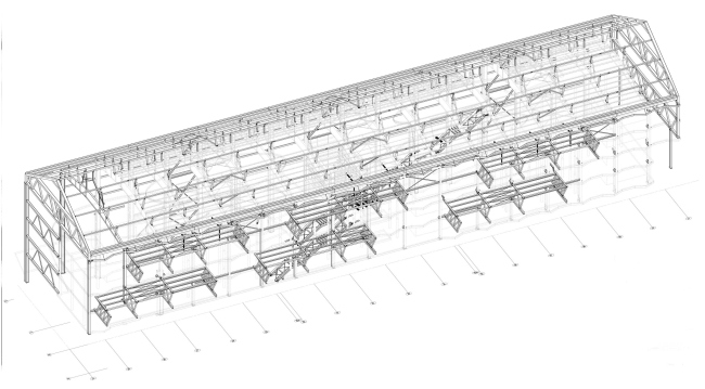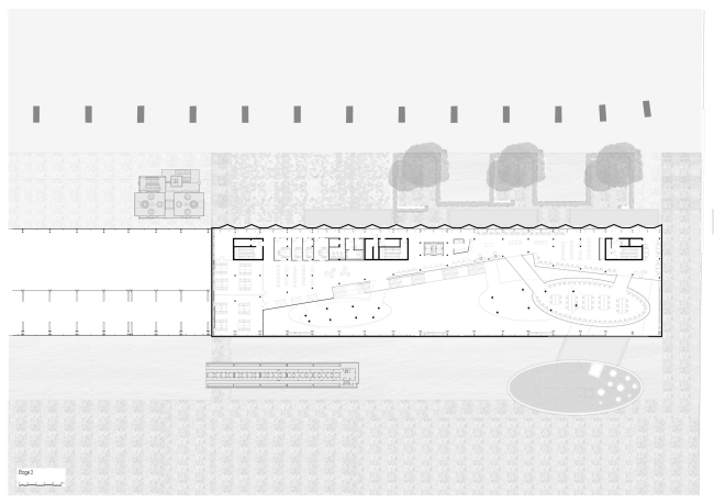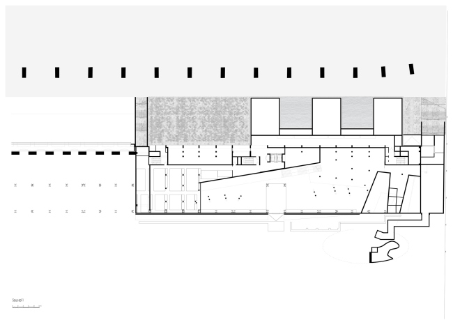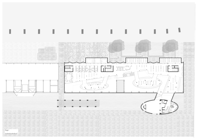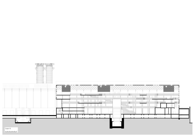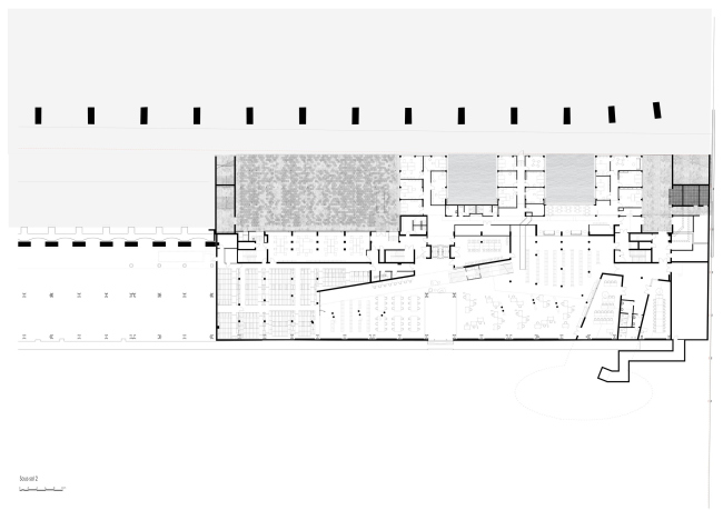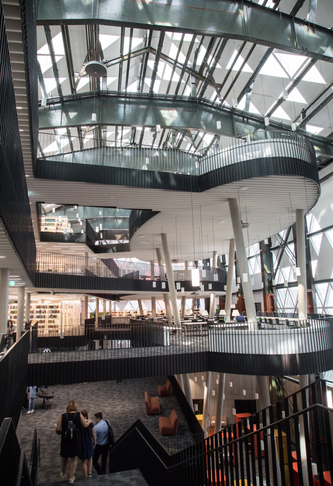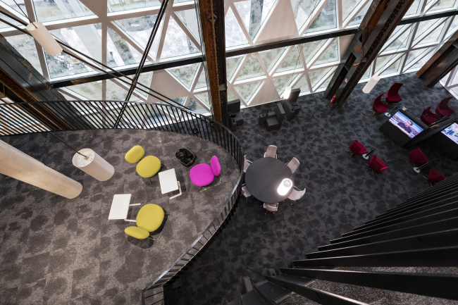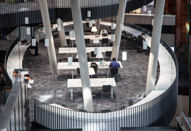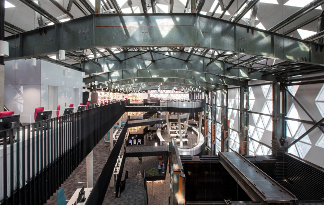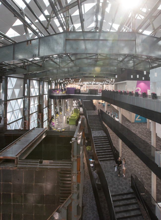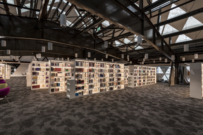 Внутри прекрасно читается индустриальное прошлое здания, его конструкция открыта и даже подчеркнута. Зал более 100 метров длиной прорезан «плато» этажей с учебными и читальными зонами и стеллажами. Свободный план и комфортное естественное освещение (за акустический комфорт отвечают ламели на потолке) сочетаются со сдержанным колоритом в серых тонах.