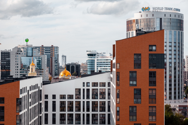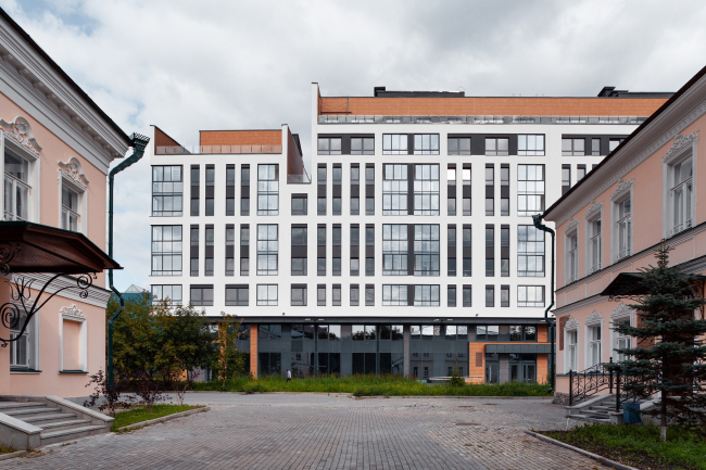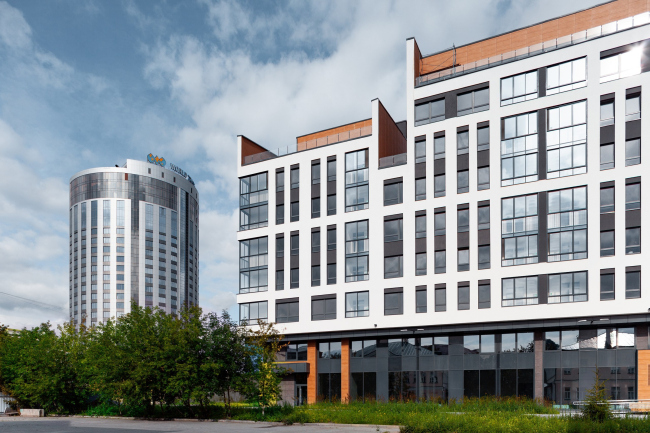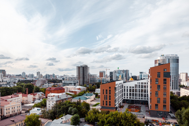 Клубный дом в историческом центре Екатеринбурга превращает разновысотность в основу образа: скос его силуэта созвучен скатным кровлям старых зданий, но он же становится ярким и современным пластическим акцентом.
