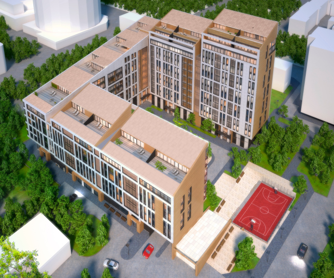 Таким образом, одной из задач, стоявших перед авторами проекта, было вписать его в многосоставную среду городского центра, причем так, «чтобы при необходимом количестве жилой площади объем здания не нарушал историческую перспективу, открывающуюся на Свято-Троицкий кафедральный собор». Собор – величественное ампирное здание с золотым куполом и высокой колокольней, стоит в соседнем квартале, рядом с ЦМТ.