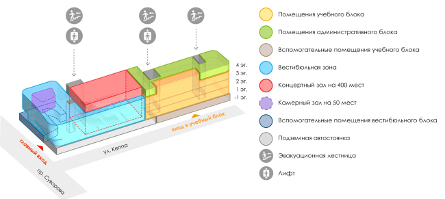 Участникам конкурса нужно было решить, как на относительно небольшом вытянутом участке разместить насыщенное функциями здание без ущерба для логистики происходящих в нем процессов. В эскизе «А.Лен» школа состоит из нескольких блоков разной высоты. Учебный корпус занимает почти половину всего объема, имеет отдельный вход и размещается в дальней от Суворовского проспекта части: окна классов таким образом выходили бы на тихие зеленые дворики. По центру в проекте расположен концертный зал, а ближе всего к библиотеке Аалто – вестибюль со сложной системой лестниц и ярусов.