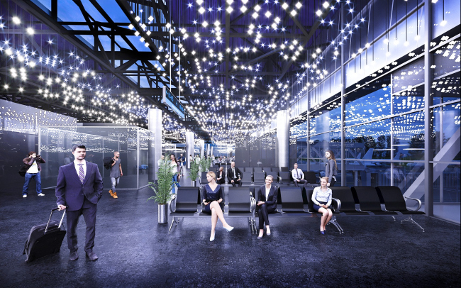 Открытый космос спрятан внутри здания, как сладкая начинка. Но слегка распробовать ее на вкус можно будет уже снаружи. Фасады терминала по всему контуру отданы витражному остеклению и почти буквально «наполнены» звездным сиянием, превращающим прозрачное стекло в подобие гигантского многоцветного экрана.