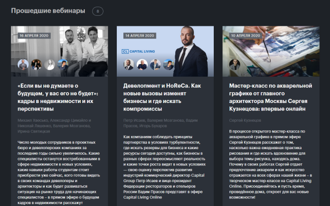Девелопер Capital Group запустил с вебинарами, интервью и прямыми эфирами экспертов в области недвижимости, строительства, архитектуры и дизайна. Новые выпуски появляются несколько раз в неделю. Прошедшие события тоже доступны для просмотра. Есть, к примеру, интервью с Сергеем Кузнецовым и его мастер-класс по акварельной графике.