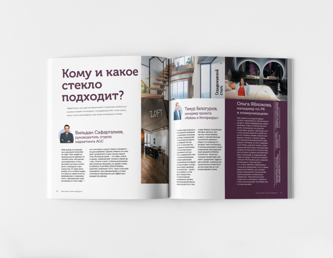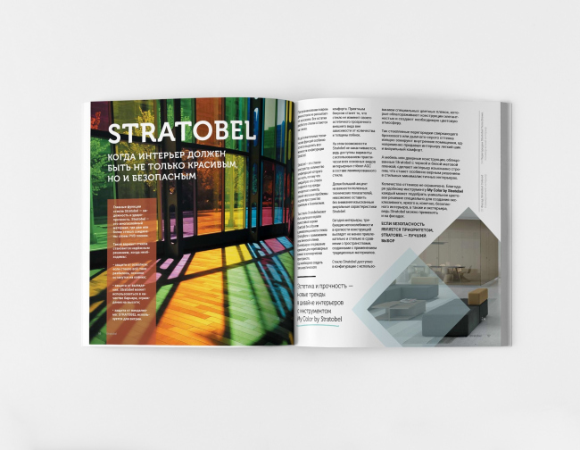 Это не буклет с продукцией в его классическом понимании, это издание, в котором компания AGC как лидер отрасли делится самыми важными и интересными темами, связанными с возможностями стекла в интерьере. Журнал выполнен в форме портфолио, где показаны возможности применения стекла и описаны его свойства так, чтобы, вдохновившись современными материалами, читатели самостоятельно смогли придумать собственные неповторимые решения.
