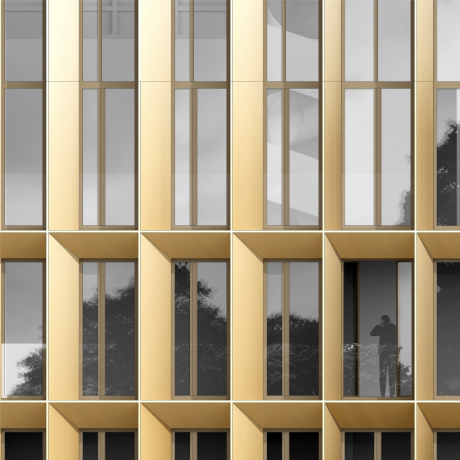 Но, надо думать, бронза появилась в проекте Сергея по иной причине, – а именно, из-за солнца. Представим себе, как золотистый фасад малого корпуса будет отражать восходящее солнце, бросая блики во двор и насыщая его поутру светом. Затем – как откосы западного фасада будут ловить отблески закатного солнца на западе. Даже сейчас, если посмотреть вечером на перекресток с западной стороны, окна 16-этажной пластины бывшего института азотной промышленности показывают нам промо-версию, трейлер того эффекта, который будут производить окна дома и его бронзовые рамы на закате. В этот момент хочется вспомнить не только о римском бронзовом зеркале, но и о латунных рамах зданий 1970-х годов – с ними тоже возникают переклички.