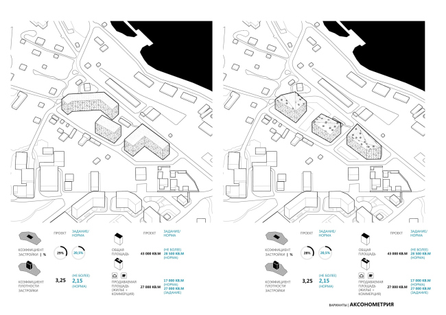По словам одного из ведущих архитекторов проекта Василия Крапивина, танец с нормами и ТЭПами в этом проекте был одним из самых сложных. Изначально заказчик провел закрытый конкурс и попросил бюро переработать один из вариантов с тремя протяженными корпусами. Чтобы уйти от «ощущения стены», ОСА предложило низкие массивные урбан-виллы, которые формировали проницаемое пространство, но были отвергнуты из-за квартирографии: чтобы этаж оставался эффективным, пришлось бы делать очень большие квартиры, при том что площади муниципальных квартир, а их порядка половины от общего числа, жестко регламентированы.