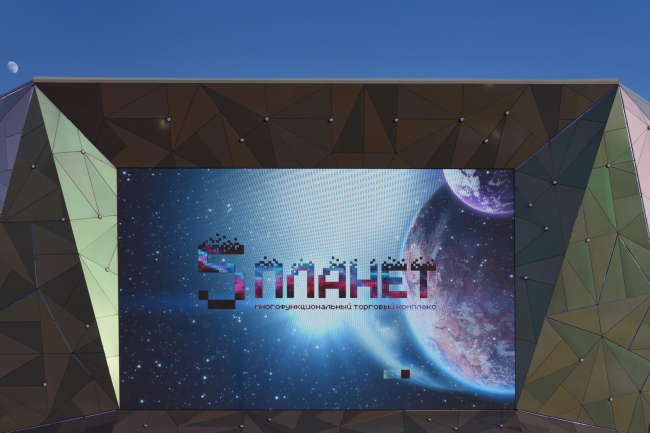 Но вернемся к МТРЦ «Пять планет». Оболочка торгового центра решена, в общем-то, симметрично: она обнимает три видимых со стороны шоссе фасада и «смотрит» на него устрановленным в центре медийным экраном в широкой раме, разворачивая по сторонам широкие «крылья». Но это анфас.