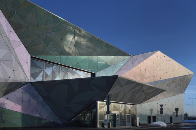 Объемная «кожа» фасадов составлена из треугольных металлических кассет разного размера и формы, – их поверхность по-разному отражает солненые лучи, усиливая то золотисто-желтый, то прохладный зеленоватый оттенок. Она, к тому же, отлично ловит закатный свет, благо главный фасад обращен на запад.