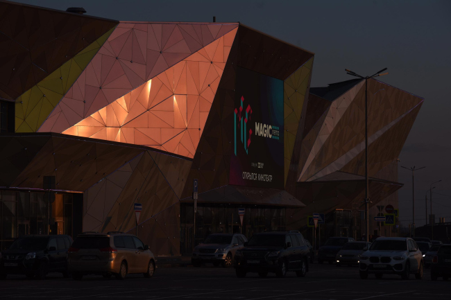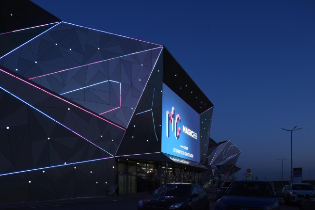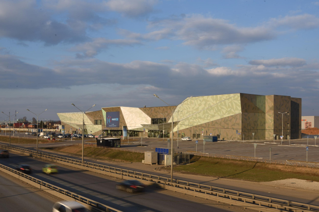 Хорошо известно, что торговый центр – здание, по определению замкнутое внутрь себя. Маркетинговые правила не приветствуют окон наружу, покупатель не должен отвлекаться на внешний мир – поэтому архитектурная задача при проектировании ТРЦ заключается в том, чтобы цельно и ярко подать крупную интерную массу. Для чего отлично подходит примененный здесь «скульптурный» подход, он лепит форму, удивляет и увлекает. Реклама же, которой ТРЦ иногда бывают облеплены с ног до головы, «собрана» в экран над входом и не нарушает цельности объема.