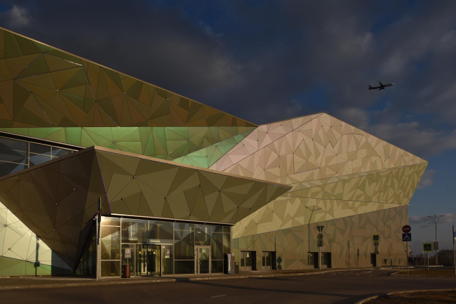 К тому же здание отлично перекликается с самолетами, заходящими на посадку в Шереметьево: как будто оно тоже летательный аппарат, такой же блестящий и металлический.