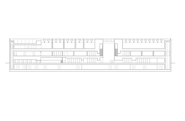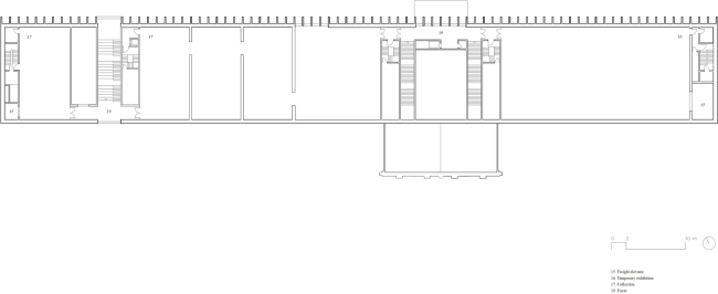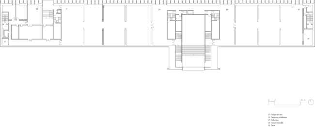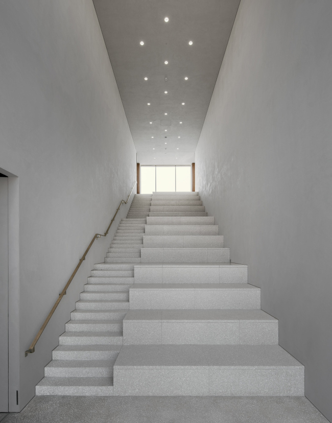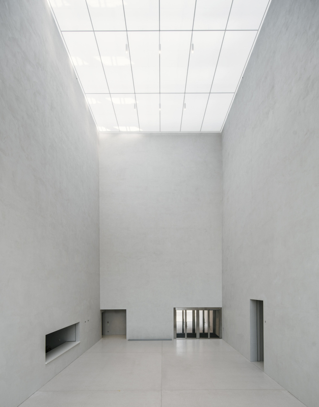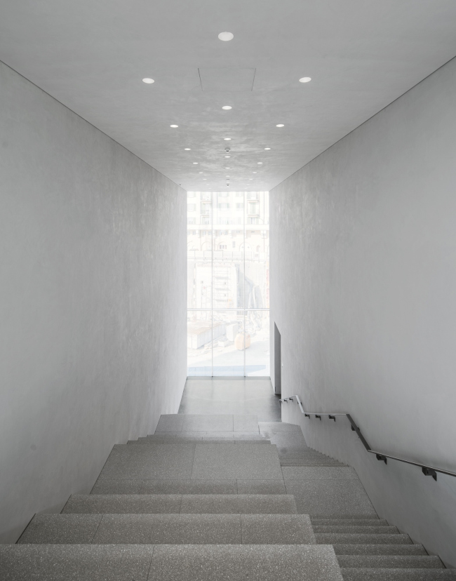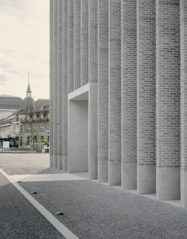 В итоге, от депо остался лишь конец «рукава», который выступает из стены музея, обращенной к железнодорожным путям. Лаконичный прямоугольный объем MCBA, задуманный Barozzi Veiga – это отсылка к индустриальному прошлому (и настоящему) участка, и нигде она так сильно не проявлена, как с этой, южной стороны. Но монолитная поверхность – это еще и утилитарный ответ на шум и вибрацию поездов, а также возможность аварии с участием состава, перевозящего взрывоопасный химический груз. Еще одним соображением была защита экспозиции от солнечных лучей с юга.
