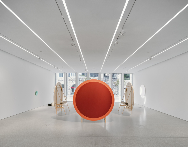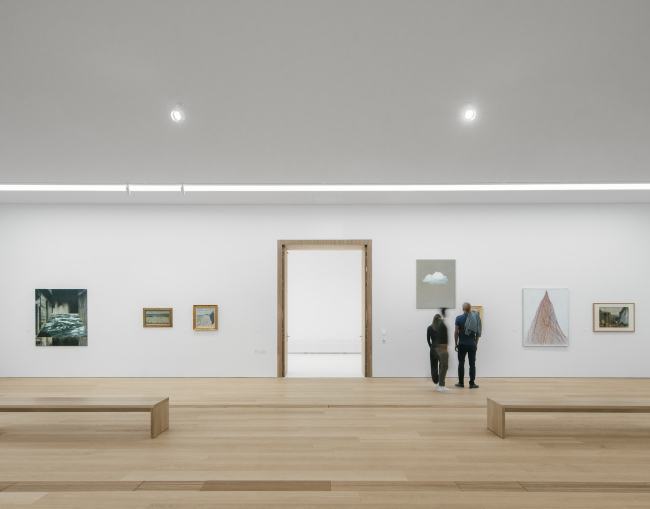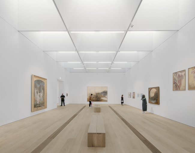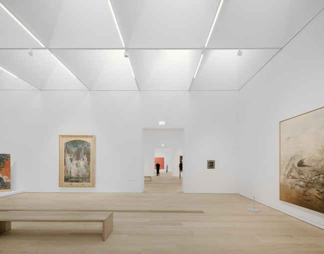 На первом этаже помещены аудитория, кафе, музейный магазин, выставочные залы, которые продолжаются на втором и третьем уровнях. Вестибюль и парадная лестница делят здание по высоте на две неравные части, что помогает устраивать одновременно несколько выставок, хотя вариант единой экспозиции тоже возможен. Окна на северном фасаде, а также фонари в перекрытиях обеспечивают залы естественным освещением – сквозь разнообразные фильтры. Бюджет проекта в целом – 84,5 млн франков, из этой суммы затраты на здание составили 64 715 000 франков.