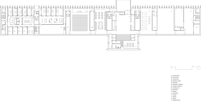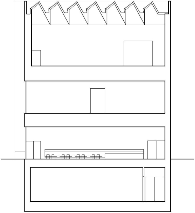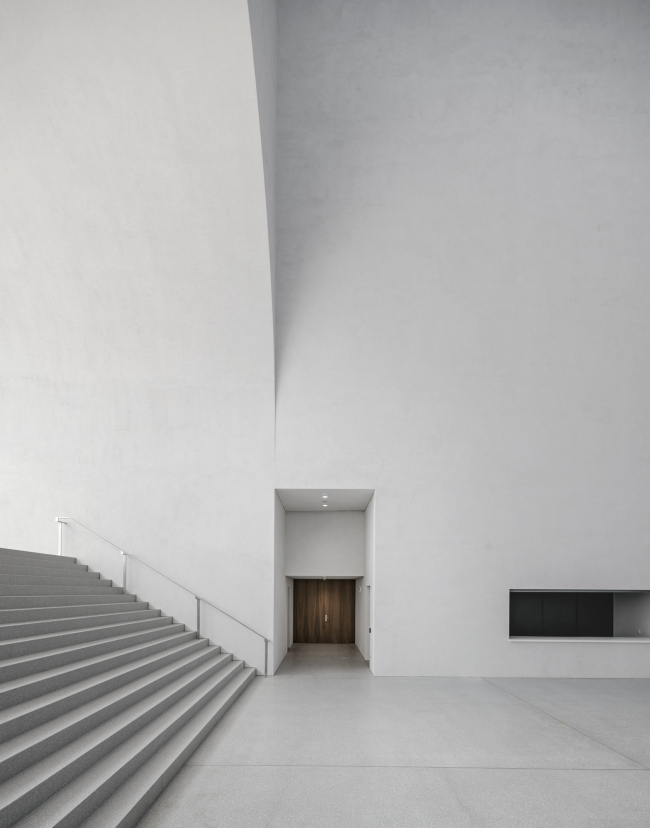 Такие же монолитные торцы отличаются лишь тем, что на восточном, встречающим идущих от вокзала посетителей фасаде рельеф повторяет силуэт другого «рукава» депо. Лишь с обращенной к центру города северной стороны музей предстает более открытым: с глубокими пластинами-ламелями, которые, как и остальные внешние поверхности здания, покрыты светло-серым клинкером – еще одним напоминанием о промышленном контексте.
