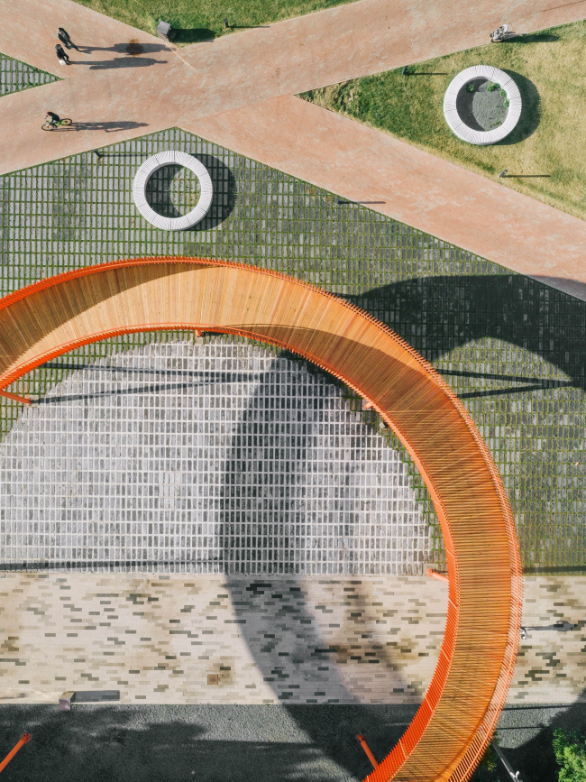 Узловые зоны формируют новые точки притяжения: треугольное кафе-амфитеатр и обзорная площадка «Спираль», окрашенные в оригинальный оранжевый цвет кабин КамАЗа, помимо своих функций, придают новое вертикальное измерение всей площади; гигантский круглый фонтан, превращающийся зимой в каток и место установки главной новогодней елки Челнов.