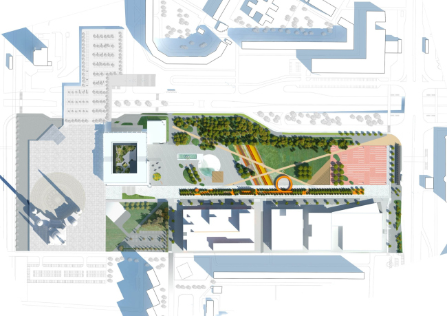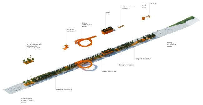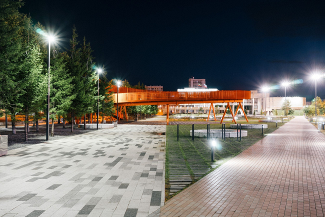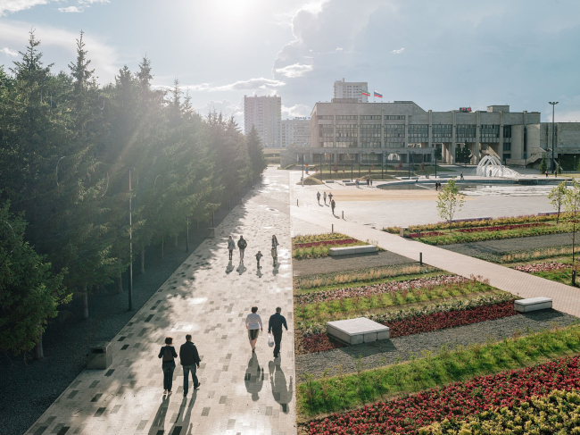 Мы стратегически переместили пешеходную ось от центра площади к ее краю, вдоль которого уже существовала линия плотно посаженных деревьев – лип, красных кленов, голубых елей. Таким образом, передвижение по площади потеряло былой идеологический пафос, стало защищенным от ветра и солнца и обрело связанность с окружающей застройкой. Получившийся Променад мы наполнили новыми функциями – киоски, обзорная и игровая площадки, подиум.