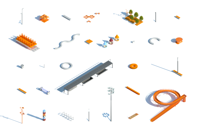 Вместе с павильонами нами были разработаны уникальные малые архитектурные формы и фонари, устанавливающие своими простыми геометрическими формами связь с эстетикой всего города. Они были выполнены местными промышленными предприятиями, специально перепрофилировавшими под наш проект часть своих мощностей, создав таким образом новую нишу городской экономики. Так, например, для площадки-спирали были использованы технологии производства газовых трубопроводов, скамейки сделаны на местном заводе железобетонных изделий, фонари сварены из типовых стальных профилей. Дополнительную ценность проекту придает тот факт, что он реализован совместно с местными специалистами, и многие решения в области благоустройства были отработаны в Набережных Челнах впервые.