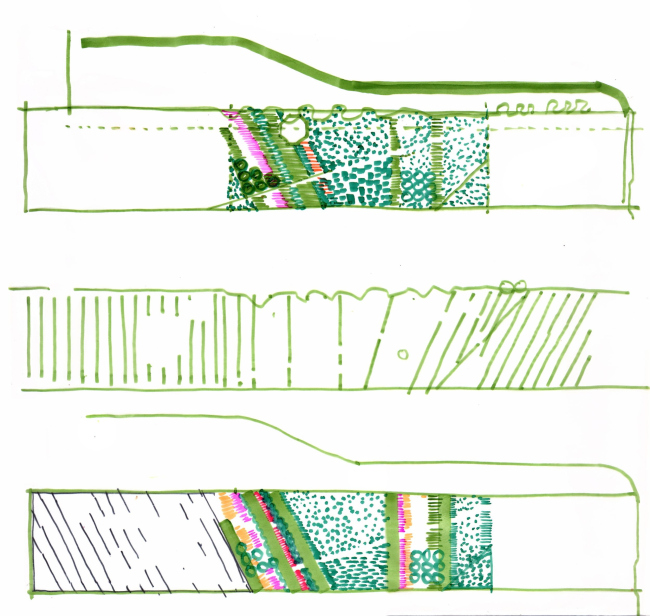 Освободившуюся от циркуляции центральную зону мы превратили в «Городской ковер» – анфиладу из трех площадей, каждая со своим характером: Площадь мероприятий – большое замощенное пространство для активной молодежи и устройства временных рынков; «Зеленая площадь» – место для отдыха на траве и большие цветовые композиции от Горзеленхоза (городского департамента по озеленению); Площадь культуры – пространство для выступления артистов под открытым небом вокруг трансформированного и расширенного старого фонтана, вход в кинотеатр в здании мэрии. Усиливая функциональную насыщенность пространства, мы расположили главные павильоны в местах, где Променад стыкуется с площадями.