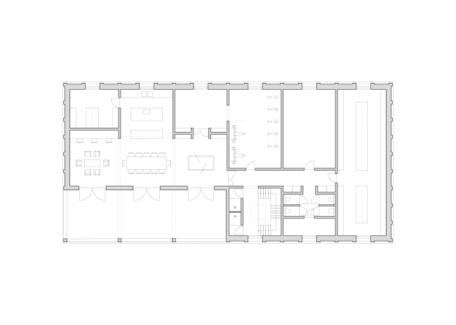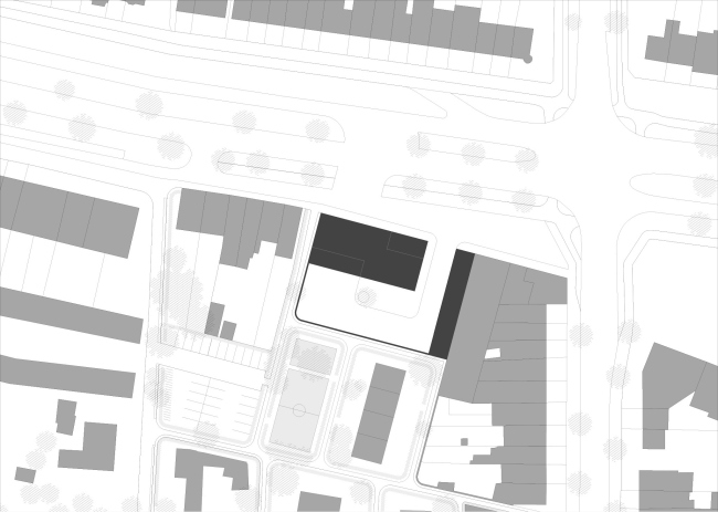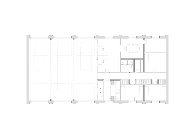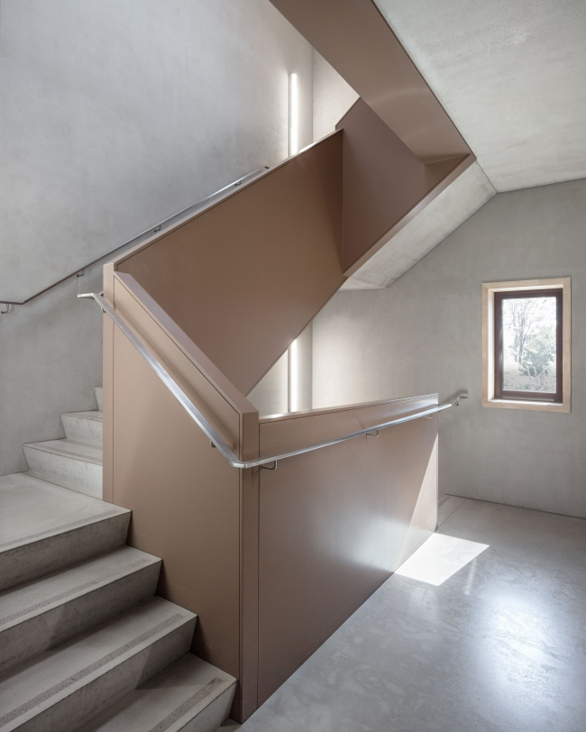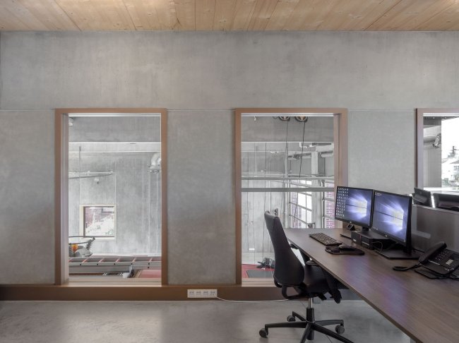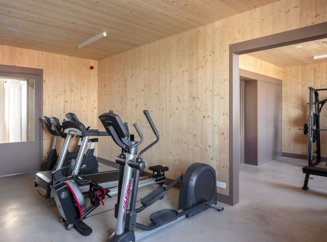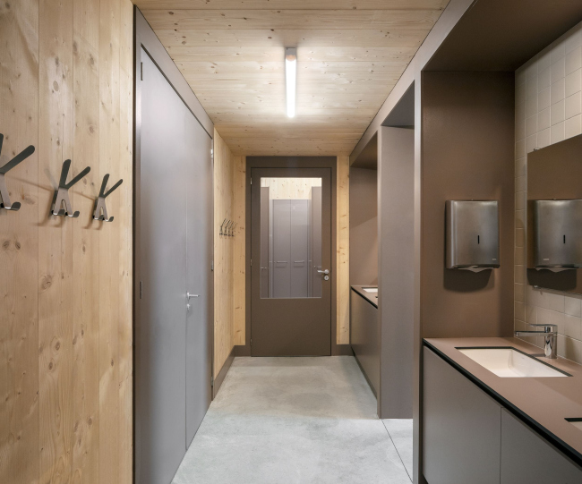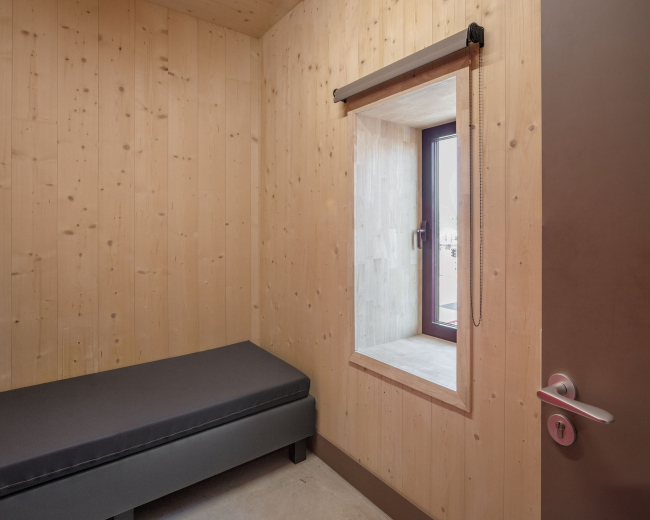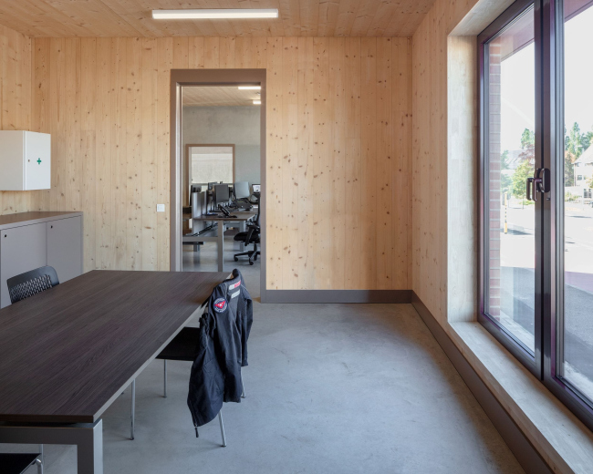 За фасадом из кладки – глазурованный кирпич с контрастным белым раствором – не заметить разницу в основном материале: гараж, пространство для машин – бетонный, верхняя, «человеческая» часть – из поперечно-клееной древесины (CLT). Дерево призвано сделать интерьер теплым – в первую очередь, психологически. В части служат 56 пожарных, в смене – восемь человек. В спальне 15 кроватей, но матрас у каждого сотрудника – свой. Предусмотрена и терраса для отдыха: со стороны более тихого заднего фасада.