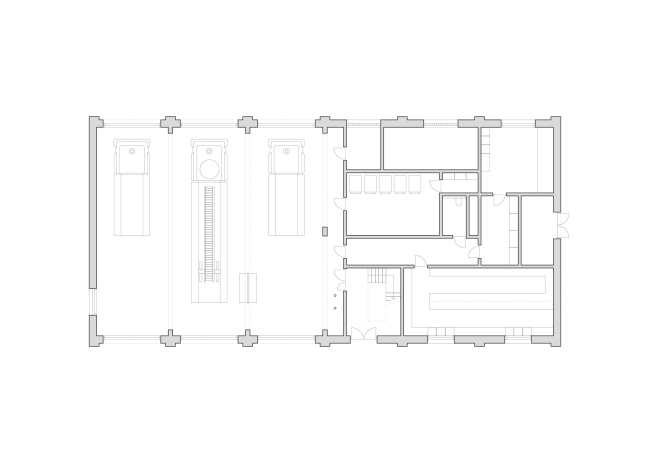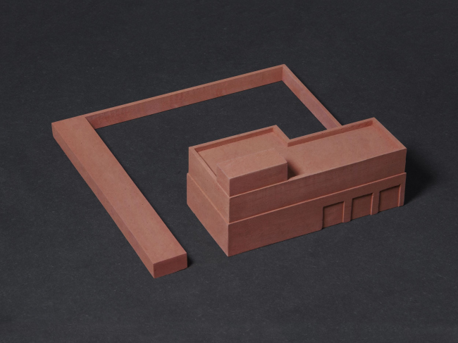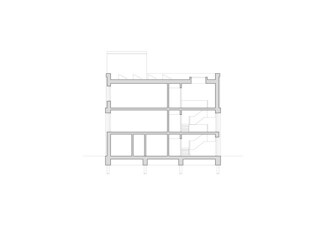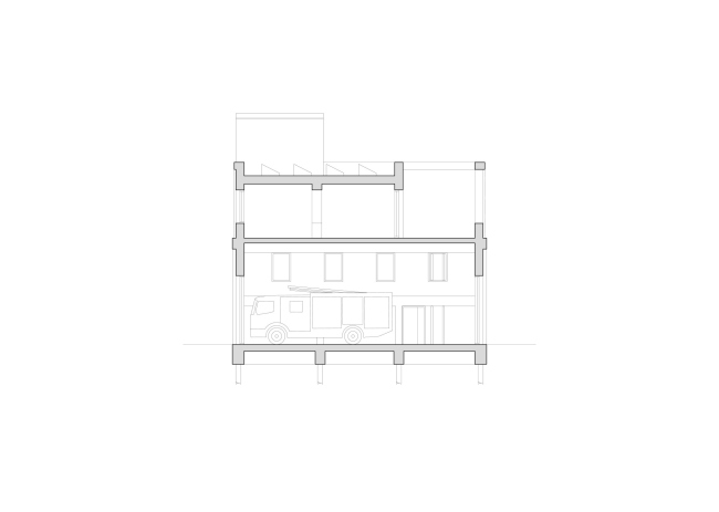 Здание вытянуто вдоль дороги. По его главному фасаду ясна структура постройки: гараж/депо занимает первый, двусветный уровень, выше находятся жилые и офисные пространства, в башенке – технические помещения. Каждый уровень сдвинут на 10 см от красной линии по сравнению с нижним.