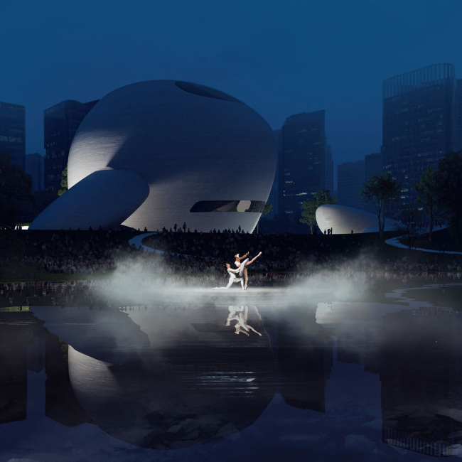 Зеркальный пруд с пологими берегами одновременно служит амфитеатром на 10 000 человек. Разнообразные террасы также подходят для проведения спектаклей и выставок.