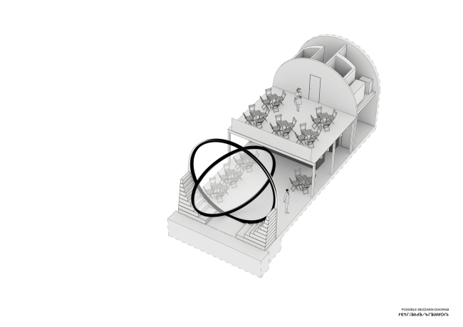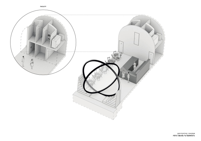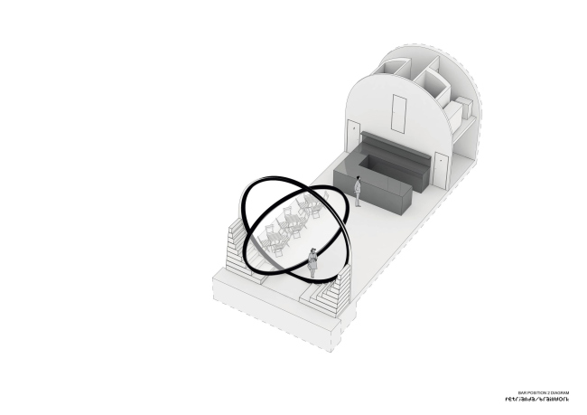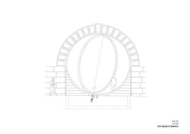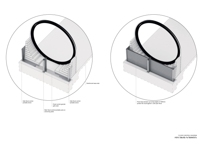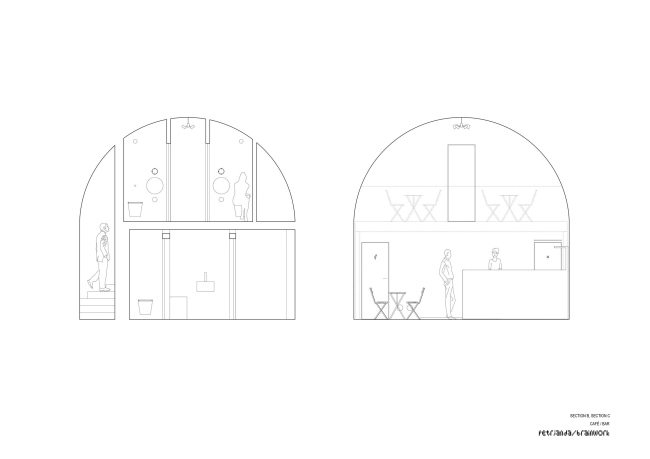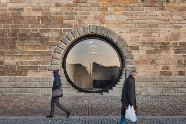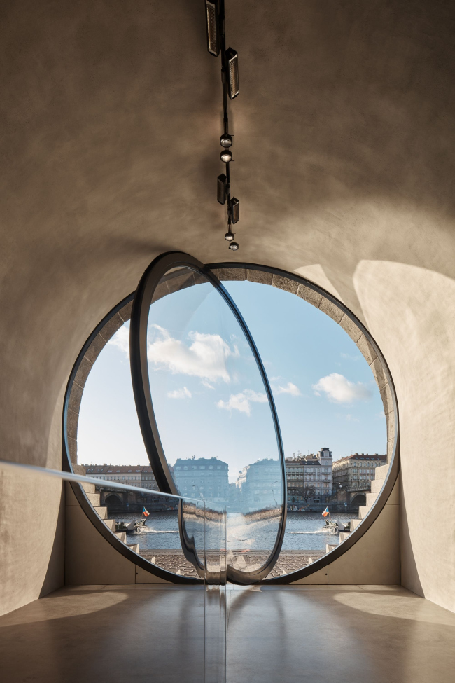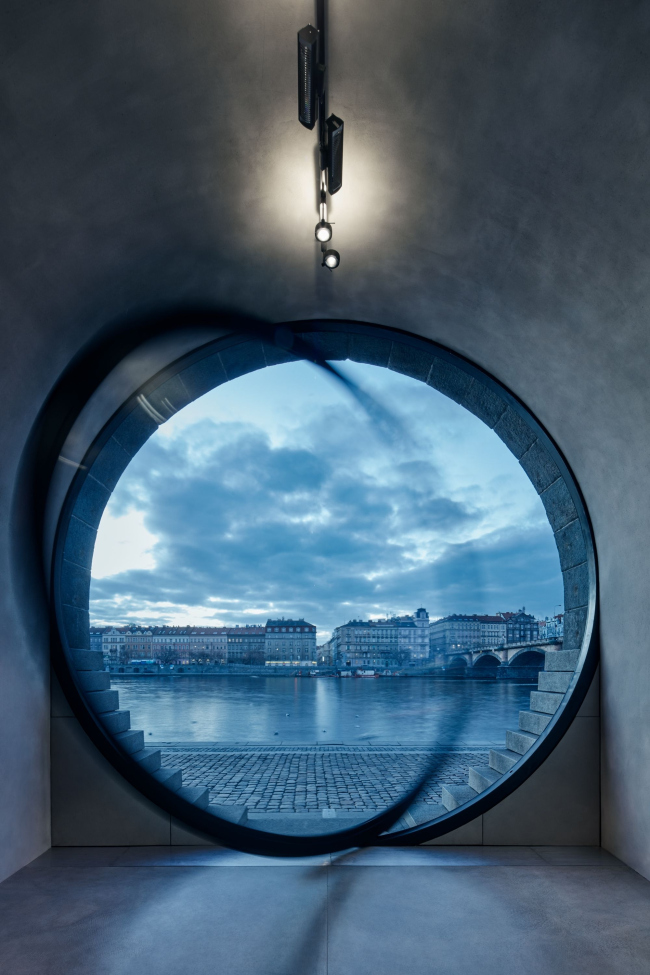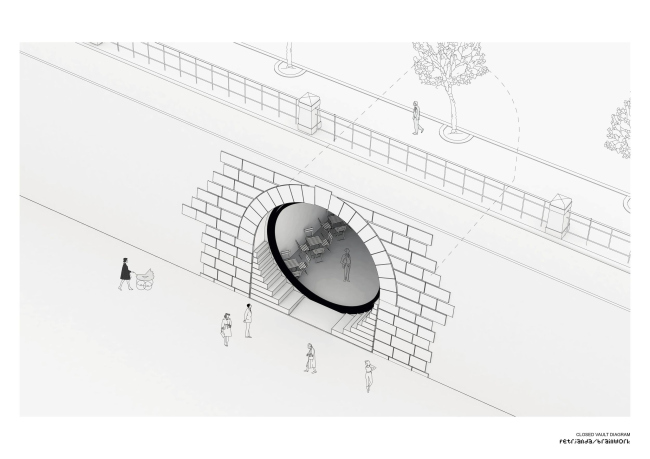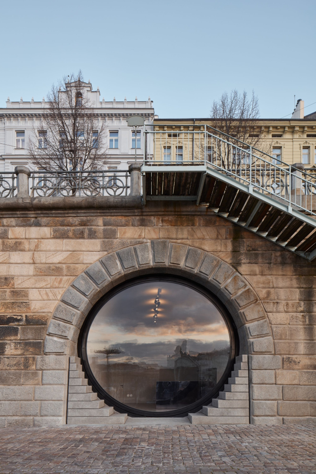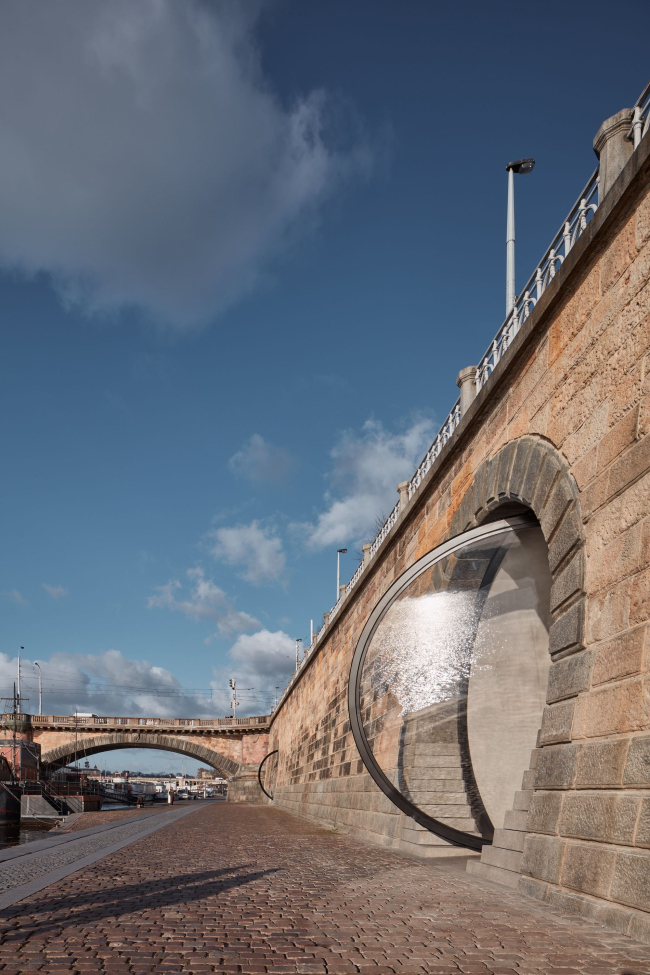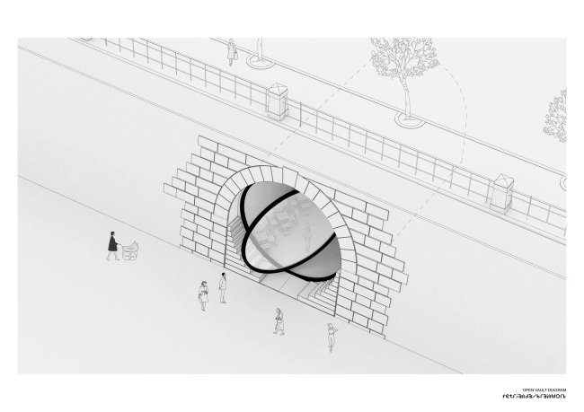 Шесть погребов на Рашиновой набережной теперь имеют элегантные, почти идеально круглые входы. Туда вставлены стеклянные двери-окна с поворотным механизмом с мотором, так как вес этих конструкций – несколько тонн. Использовано органическое стекло толщиной 7 см. Работать заведениям внутри удобней всего, когда окна открыты на 60%. Изначально входы были полуциркульными арками, но «ступени» снизу довели их форму до окружности. В «ступенях», напоминающих о разобранных в ходе реконструкции технических лестницах, скрыто вентиляционное оборудование, система защиты от наводнений и т.д.