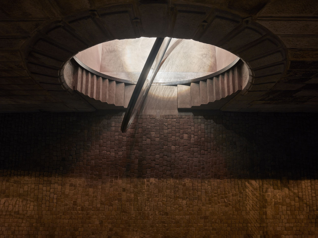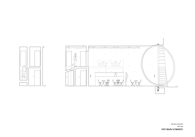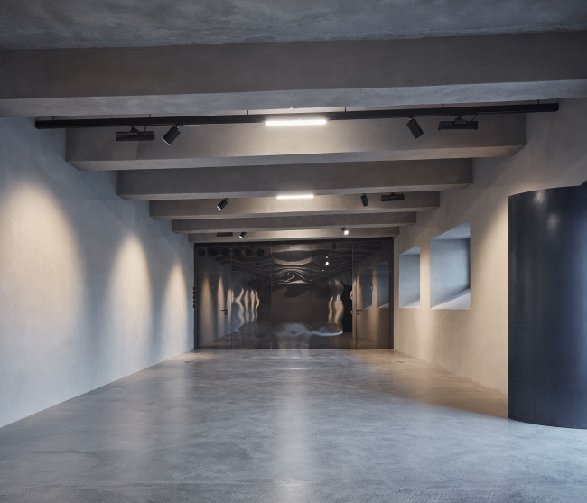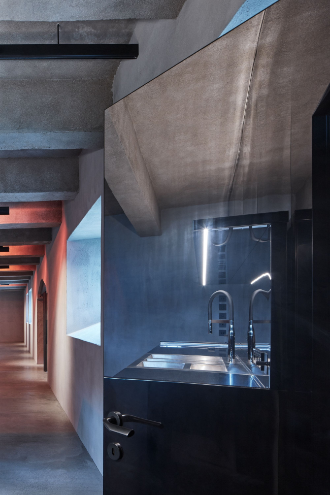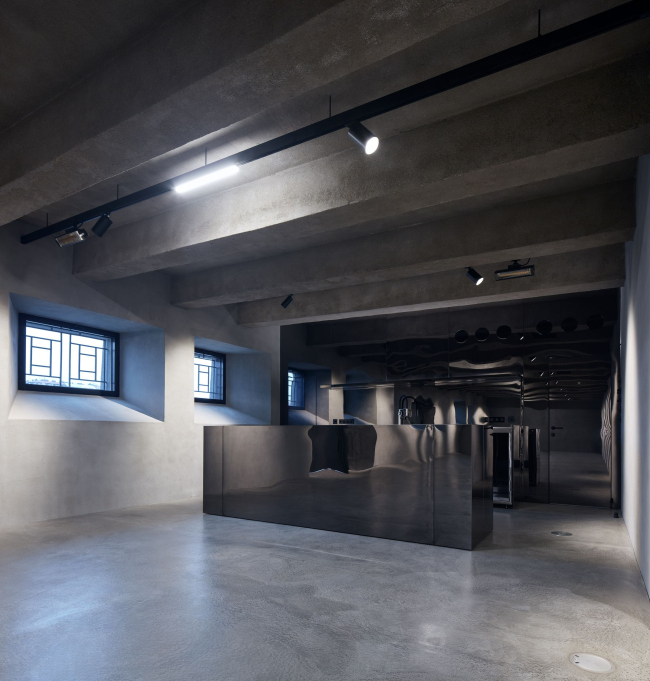 Интерьер был полностью очищен от наполнения, включая межэтажные перегородки, и все поверхности покрыты торкретированным бетоном. Новые конструкции были выполнены из монолитного бетона (лестницы и т.д.), другие элементы – например, барные стойки – из темной стали.