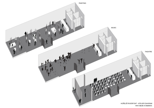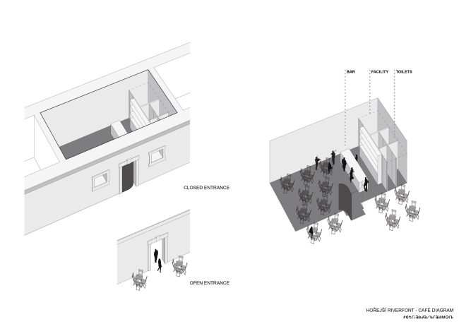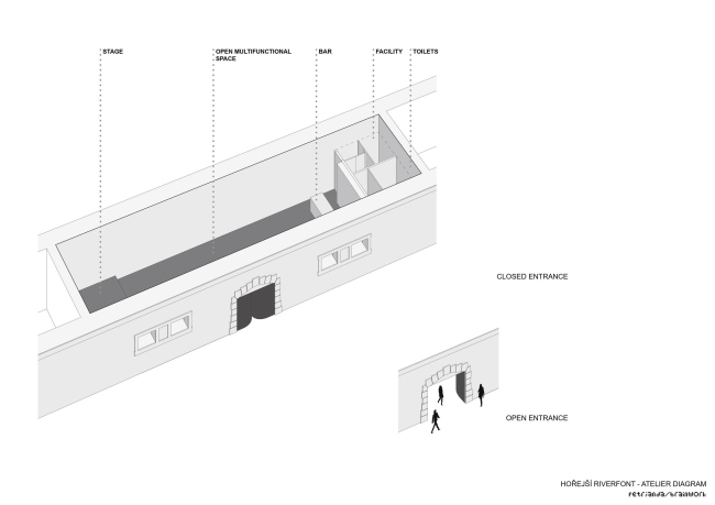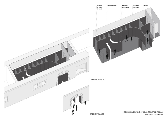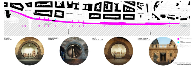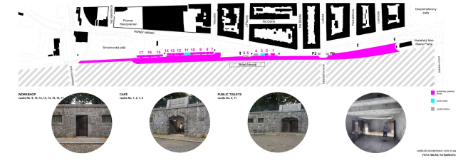 Контекст требовал взвешенного подхода, поэтому проект реконструкции набережных разрабатывался не как чисто архитектурный, а как социокультурный, причем первая его очередь заняла 10 лет, и строительство здесь было последним этапом. Это вложение в общественные пространства Праги, самое крупное с революции 1989 года (бюджет 6,5 млн евро), включает в себя превращение 20 погребов для хранения льда в объекты инфраструктуры. Там размещены бары, кафе, клубы, различные студии и мастерские, художественные галереи, филиал библиотеки, центр местного сообщества, туалеты.