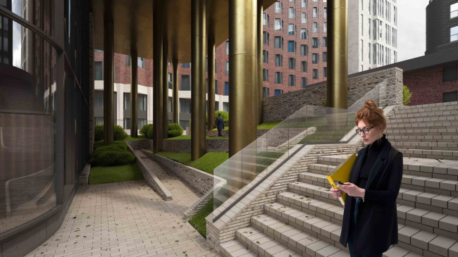 В победившем проекте ребенку, чтобы войти в школу, придется не только пройти городское пространство, но еще и почему-то спуститься по лестнице в яму.