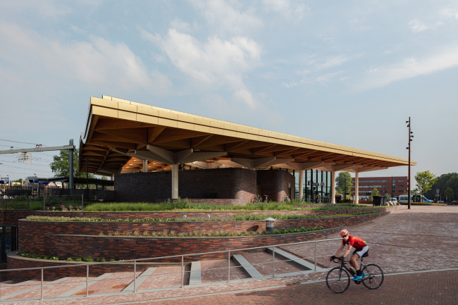 Решением стало здание без парадного фасада, где главную роль играет треугольная деревянная крыша с изящным изгибом, отмечающим вход в подземный гараж на 2600 велосипедов. Это одно из нескольких сооружений, сгруппированных под этой кровлей. Благодаря их независимости от нее и ее свободно стоящих опор, в будущем возможна любая перестройка и смена их функции. Вокзал в АссенеФото © Egbert de Boer