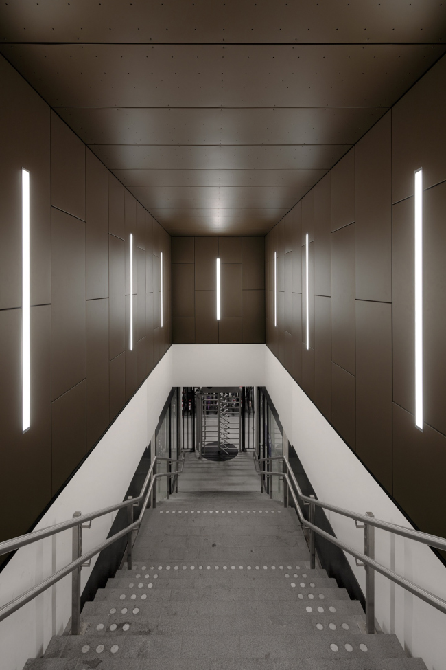 Стены вокзала облицованы кирпичом разных оттенков красного, на лестницах и в тоннелях пол покрыт красным камнем, снаружи – на новой площади – использована клинкерная брусчатка. Так здание связано с пространством города – ведь кроме него проект включает в себя новый пешеходный переход под платформами и путями, реконструированный и укороченный велосипедный тоннель, а также тоннель для автомашин.Вокзал в АссенеФото © Sebastian van Damme