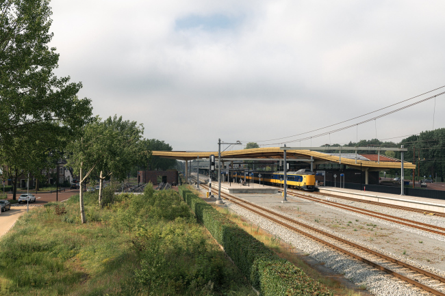 Это первая в Нидерландах деревянная кровля вокзала, полностью перекрывающая пути. Ее высота – 10 метров, стороны составляют 78, 88 и 90 м2, ее площадь – 3000 м2. Проемы в ней пропускают солнечный свет в станционный зал и на платформы. Зеленая полоса из очитка по периметру позволяет удержать дождевую воду. Опоры и края крыши покрыты металлом, окрашенным в «цвет шампанского». Вокзал в АссенеФото © Sebastian van Damme