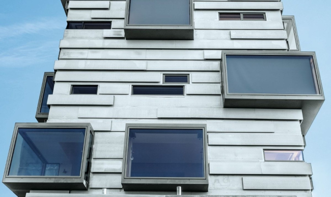 С недавних пор над Эстербро возвышается новая архитектурная достопримечательность – отель Charlotte Tower. На его проект архитекторов Lundgaard & Tranberg вдохновили расположенные здесь исторические дома с живописной кирпичной кладкой и цинковыми кровлями. Поэтому фасад новой 54-метровой башни покрыт прямоугольными кассетами различной глубины и длины из титан-цинка, напоминающими именно кирпичную кладку. Для облицовки фасада общей площадью около 3000 м² использовано порядка 45 тонн материала RHEINZINK