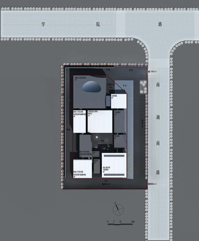 Бумагу символизируют корпуса, покрытые сборными фасадными панелями из бетона. Их поверхность расчерчена вертикальными бороздами, чтобы напоминать рисовую бумагу. В самом низу фасад не касается земли, что обозначает «отчужденность» каллиграфа. Еще один важный элемент проекта – водоем; он, как и переходы между корпусами, ракурсы и резкие смены «характера» пространства должны быстро отвлечь посетителя от будничных забот и настроить на восприятие каллиграфии.